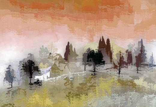 A picturesque village awakens in the gentle embrace of dawn, where soft hues of orange wash over the landscape.